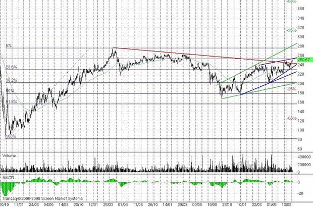 В момент публикации прошлого обзора незаслуженно обошла вниманием акции «МТС». Они с начала недели тестируют линию долгосрочного нисходящего тренда от апреля 2010 года – 247 рублей. Сегодня мы наблюдаем уверенное движение над этой линией, но пробой, подтвержденный только ценовым фильтром знаков лишь для спекулянтов. Пусть рубеж 247 рублей подтвердится и временем как поддержка. Будет ли шанс купить акции точно у поддержки в ближайшем будущем? Думаю, да! Ведь и локальное сопротивление восходящего майского канала уже близко - 253 рубля. А если сопротивление не устоит, осторожные «быки» тоже будут в выгодном положении, так как откроется цель до уровня 279-283 рубля, а уровень «стоп-лосса» можно будет задать как душе угодно.