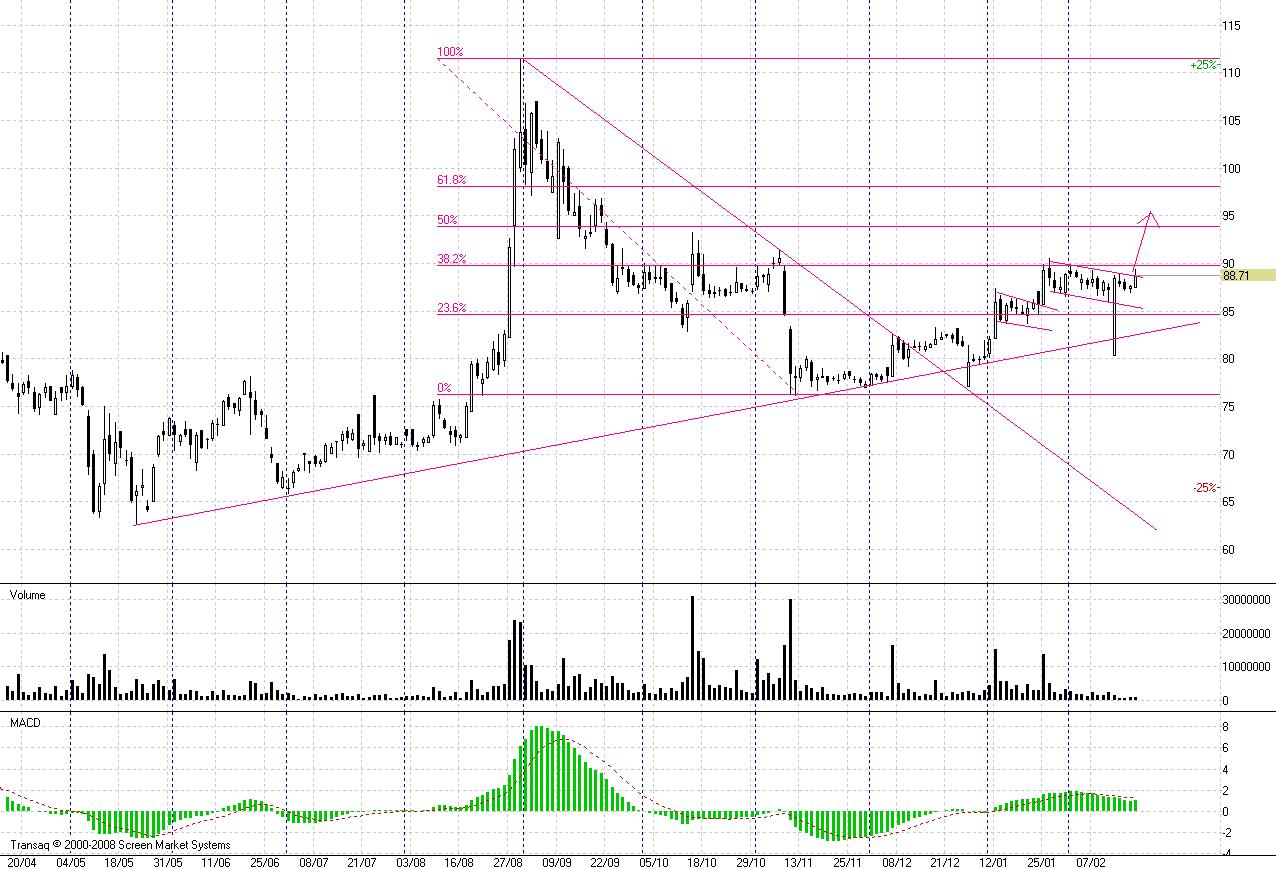 Меня попросила подруга-трейдер рассмотреть Ростелеком-ап часовой срез, но мне больше понравилась дневка. Хотя суть и там и там одна. Ни хочу никого обнадеживать, но кажется он скоро оживет. Еще бы объем пошел. Флаг на графике идет за флагом. Это сильный знак к продолжению движения. Текущий флаг сулит рост бумаг до 94-95 рублей.